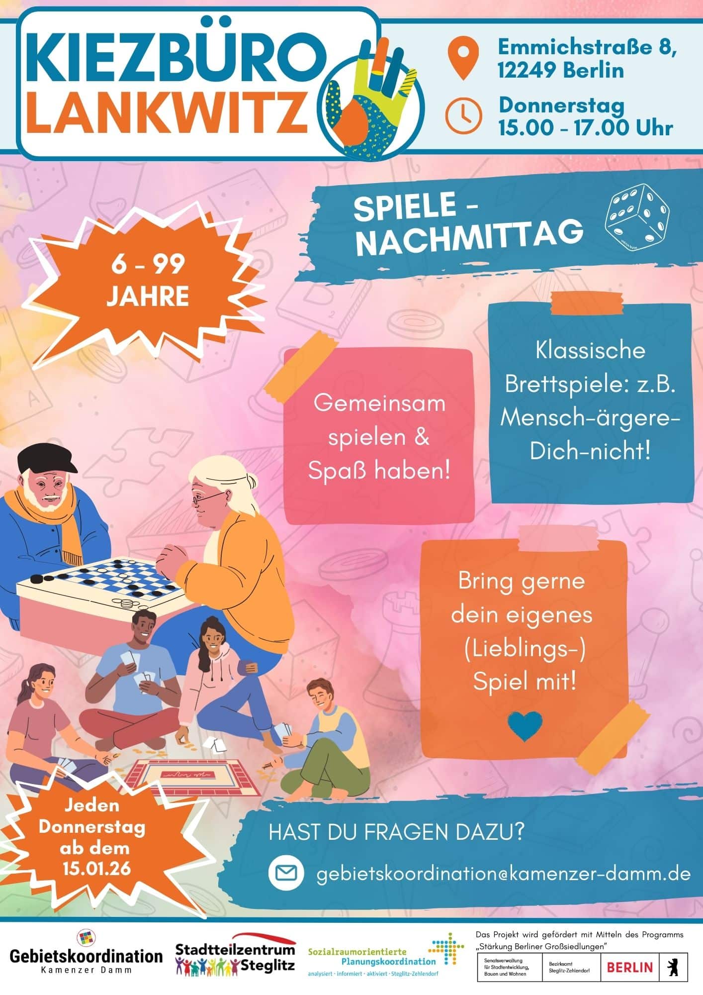 In der Emmichstraße 8 im Lankwitzer Osten findest du einen offenen Treffpunkt für die ganze Nachbarschaft. Bei uns gibt es Informationen, Beratung und viele unterschiedliche Angebote – für alle, die einen Ort suchen, an dem man sich austauschen, begegnen und miteinander vernetzen kann.